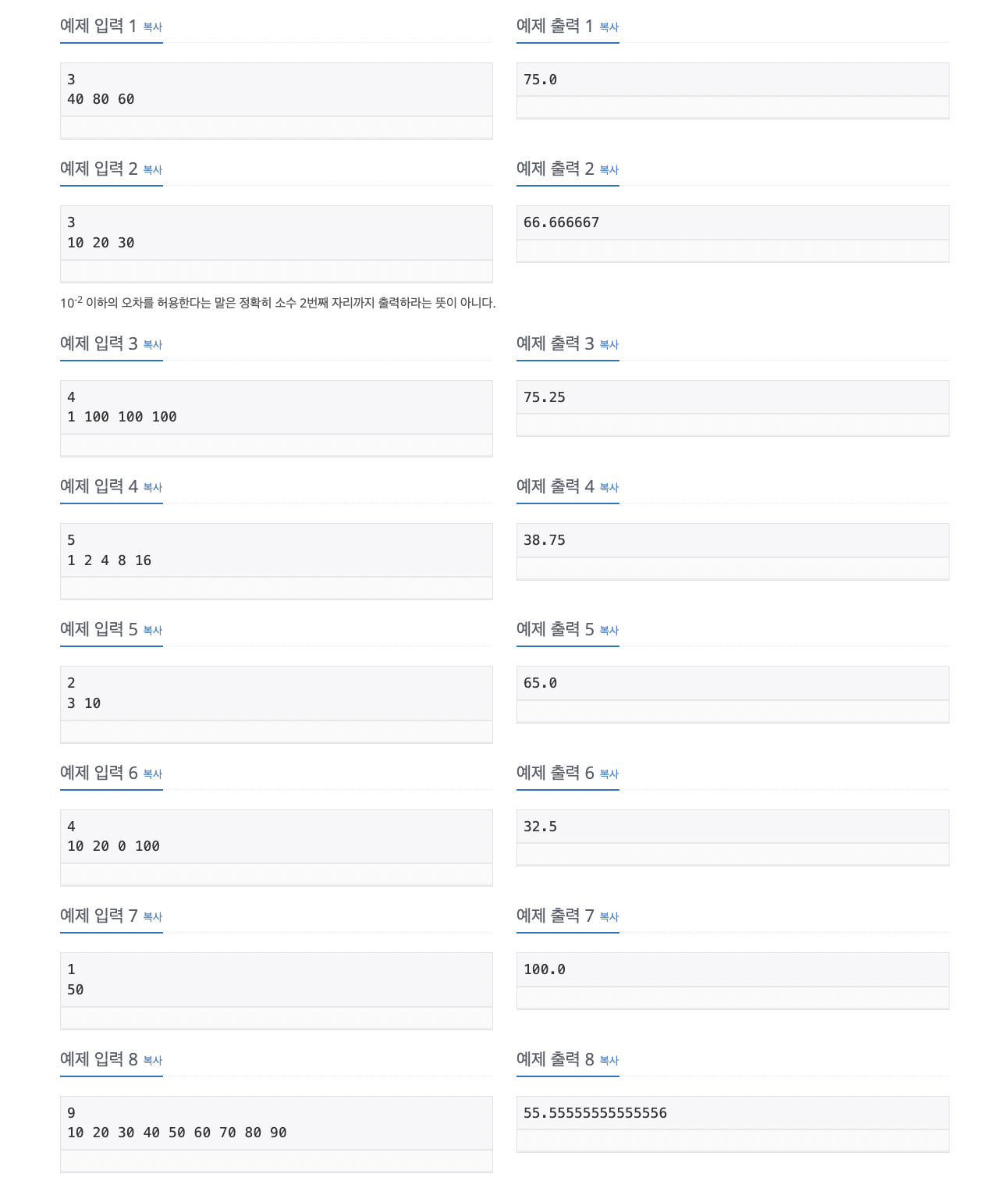첫째 줄에 새로운 평균을 출력한다. 실제 정답과 출력값의 절대오차 또는 상대오차가 10-2 이하이면 정답이다.