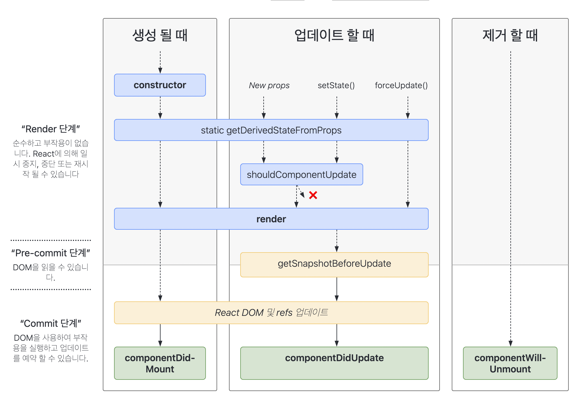 컴포넌트가 브라우저 상에 나타나고, 업데이트되고, 사라지게 될 때 호출되는 메서드들 (+ 에러발생 시 호출되는 메서드도 존재)