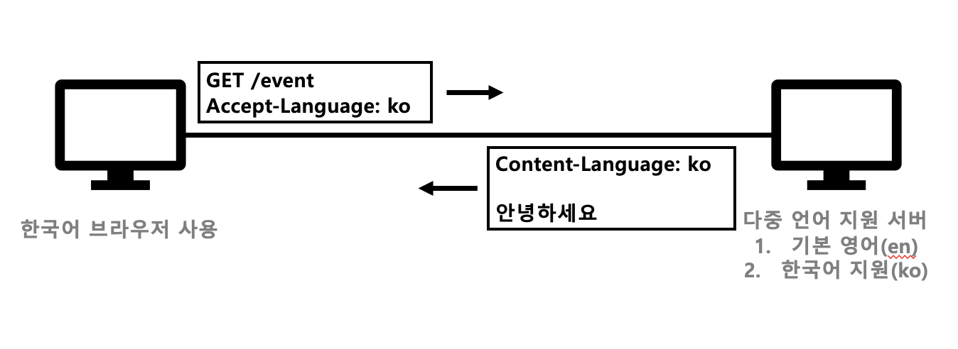 - 클라이언트가 서버로 요청을 전달 시, 한국어로 보내달라고 Accept-Language를 같이 보냄, 그 요청을 받은 서버는 한국어도 지원하기 때문에 한국어로 응답을 보냄