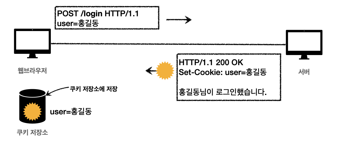 2. 서버는 Set-Cookie에 user=홍길동이라는 내용을 넣어서 보냄