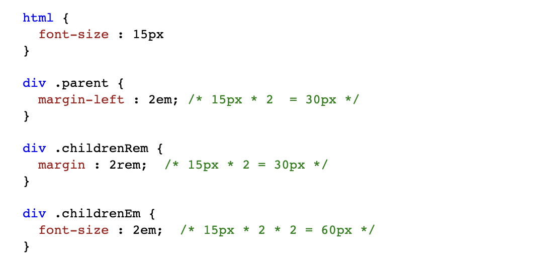 rem: 최상위 엘리먼트에서 지정된 값 기준으로 변환됨(보통 HTML tag에서 지정된 사이즈 기준)