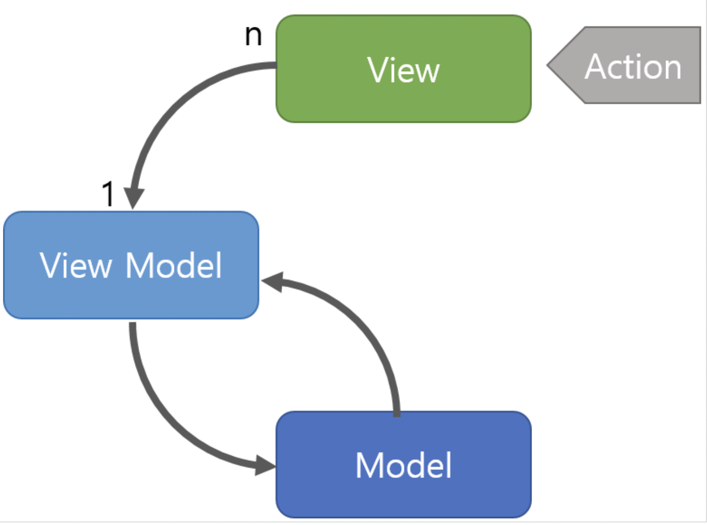 View Model: View로부터 요청을 받은 데이터를 처리하여 Model을 갱신하고, 갱신된 모델에 따라 자신이 소유한 데이터도 업데이트